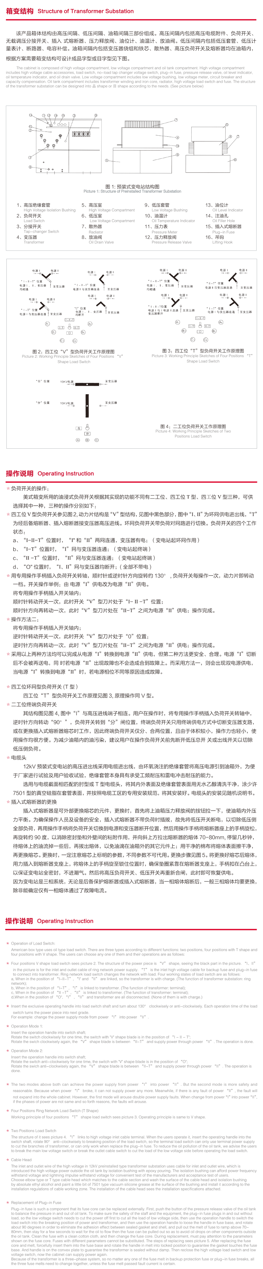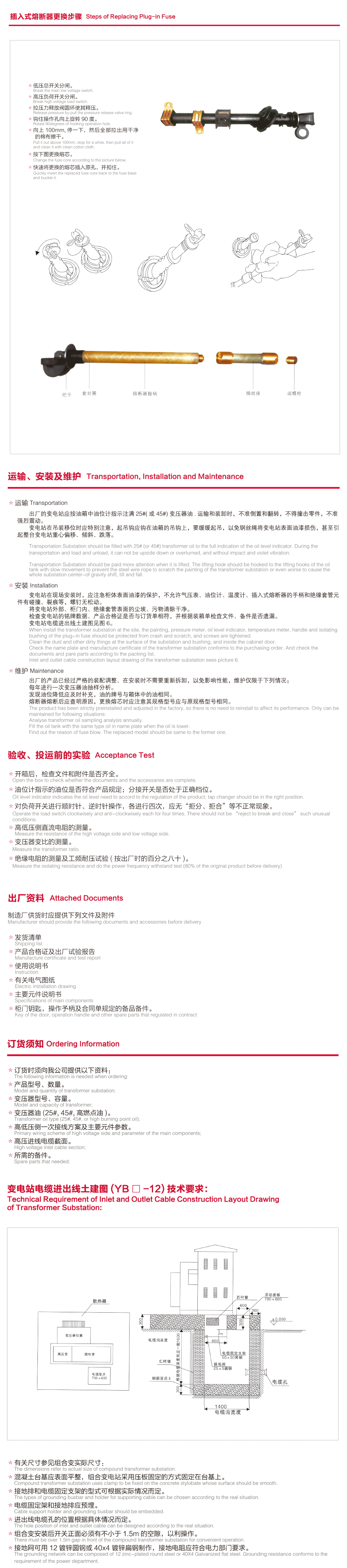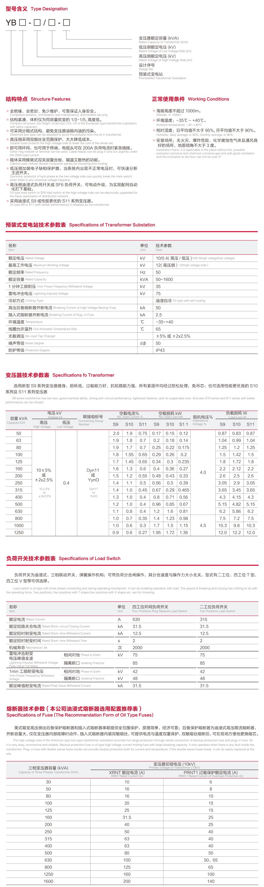 本产品是吸收国外先进技术,结合国内实际情况研制开发的,整台产品具有体积小、安装维护简便、低噪音、低损耗、防盗、过负荷能力强、全保护等特点。适用于新建小区、绿化带、公园、车站宾馆、工地、机场等场所。YB□-12系列美式预装式箱式变电站,适用于10kV环网供电,双电源供电或终端供电系统中,作为变电、计量、补偿控制和保护装置。 本产品符合下列标准:GB/T17467-2010《高压低压预装式变电站》DL/T537-93《6-35KV箱式变电站订货技术条件》
