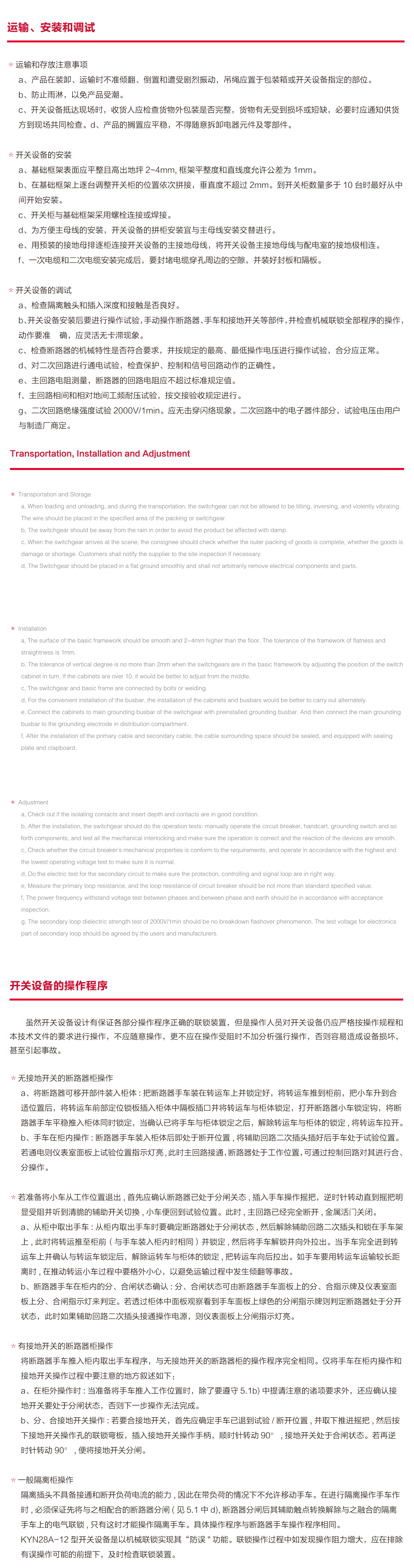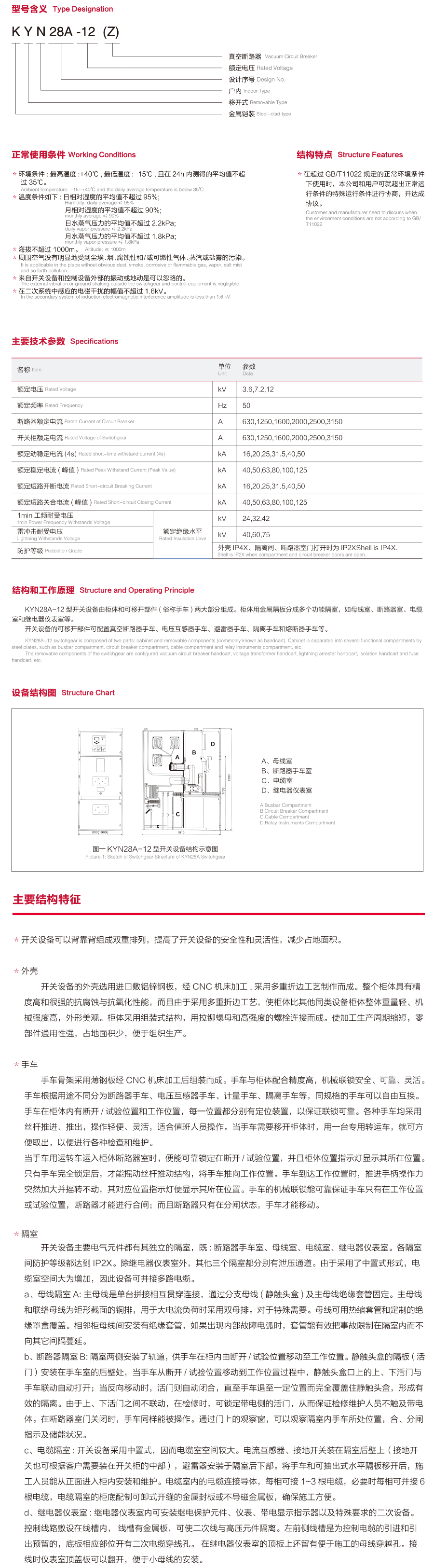 KYN28A-12型铠装移开式交流金属封闭开关设备(以下简称开关设备),适用于户内三相50/60HZ、额定电压10kV的电力系统中,主要应用于发电厂,变电所、工矿企业及高层建筑中,作为接受和分配电能并对电路实行控制、保护和监测。