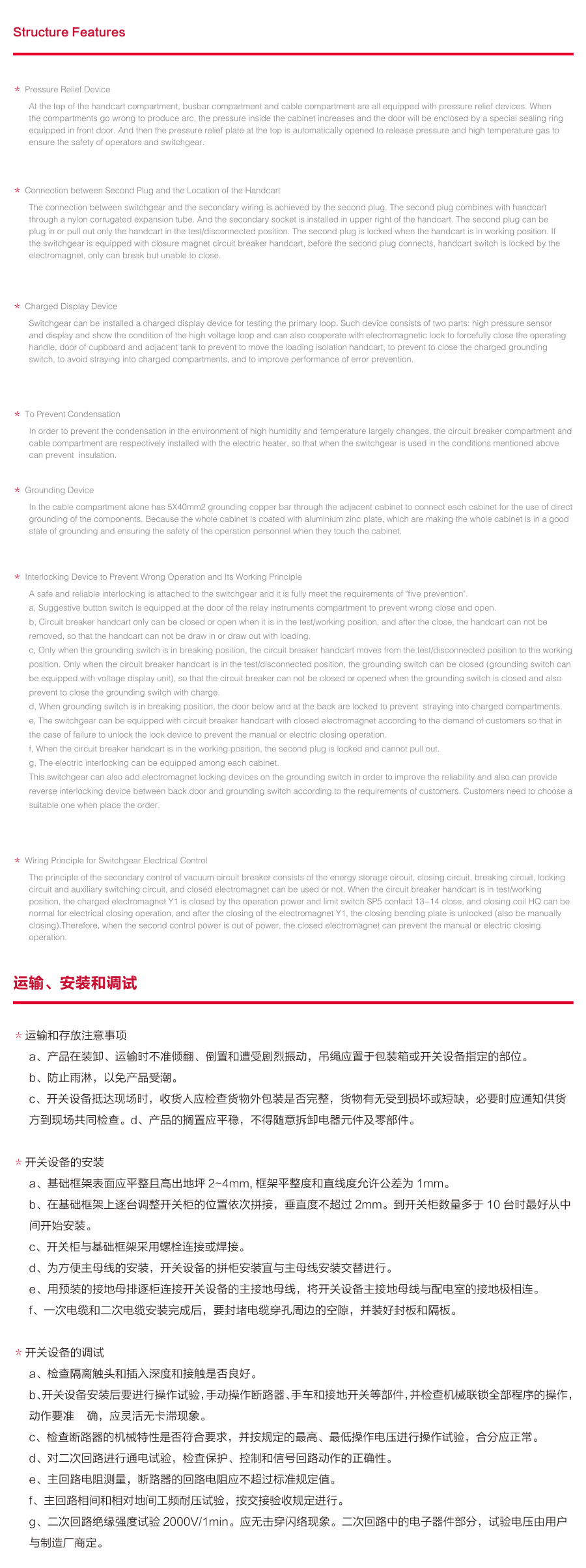 KYN28A-12型开关设备具有各种防止误操作的功能,包括防止带负荷移动手车,防止接地开关闭合位罝合断路器、防止带电合接地开关和防止误入带电隔室等功能,开关设备配罝性能优良的VS1、VD4系列中罝式高压交流真空断路器及固封式真空断路器。开关设备二次回路配罝先进可靠的控制保护元件;母线采用热缩绝缘材料或环氧涂覆的绝缘手段,优化电极形状,柜体结构紧凑,该开关设备是技术先进、性能稳定、 结构合理、使用方便、安全可靠的配电设备。